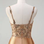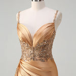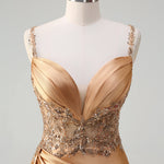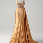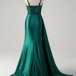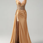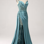 Blue Mermaid V-Neck Satin Long Appliques Sequin Prom Dress With Slit