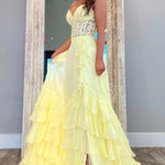 Make a statement in this stunning yellow chiffon prom dress, designed to capture attention and admiration. The sweetheart neckline frames your shoulders with romantic appeal, while intricate lace detailing adorns the bodice for refined sophistication. The A-line silhouette skims gracefully over your figure, creating a universally flattering silhouette that moves with confidence. Layered ruffle tiers in flowing chiffon add dimension and visual interest, delivering that coveted ethereal quality. The bold yellow shade projects poise and radiance, commanding presence at any formal event. Whether you're attending prom, a gala, or a milestone celebration, this dress merges timeless design principles with contemporary styling for an unforgettable evening.