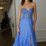 Kali | A-Line Yellow Chiffon Sweetheart Lace Long Prom Dress With Slit