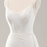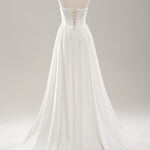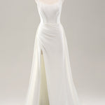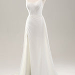 White Spaghetti Straps Satin Sweep Train Wedding Dress with Slit