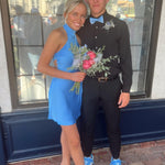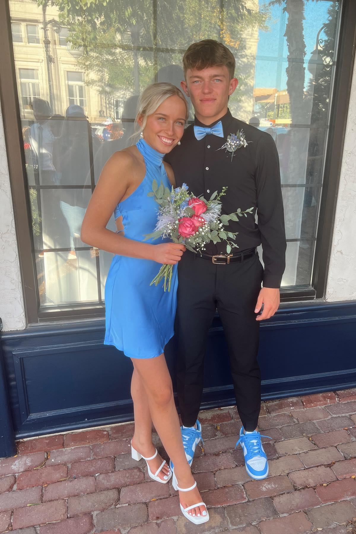 This blue satin dress features an A-line silhouette with a corset bodice and a halter neckline. It includes a back tie detail and falls above the knee, combining sophistication with a flattering fit.