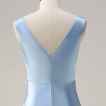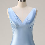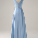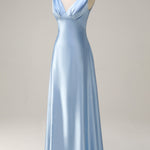 Sky Blue A Line V Neck Open Back Satin Long Bridesmaid Dress