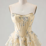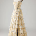Strapless Yellow Blue Flower A Line Tiered Ruffle Corset Long Prom Dress with Slit